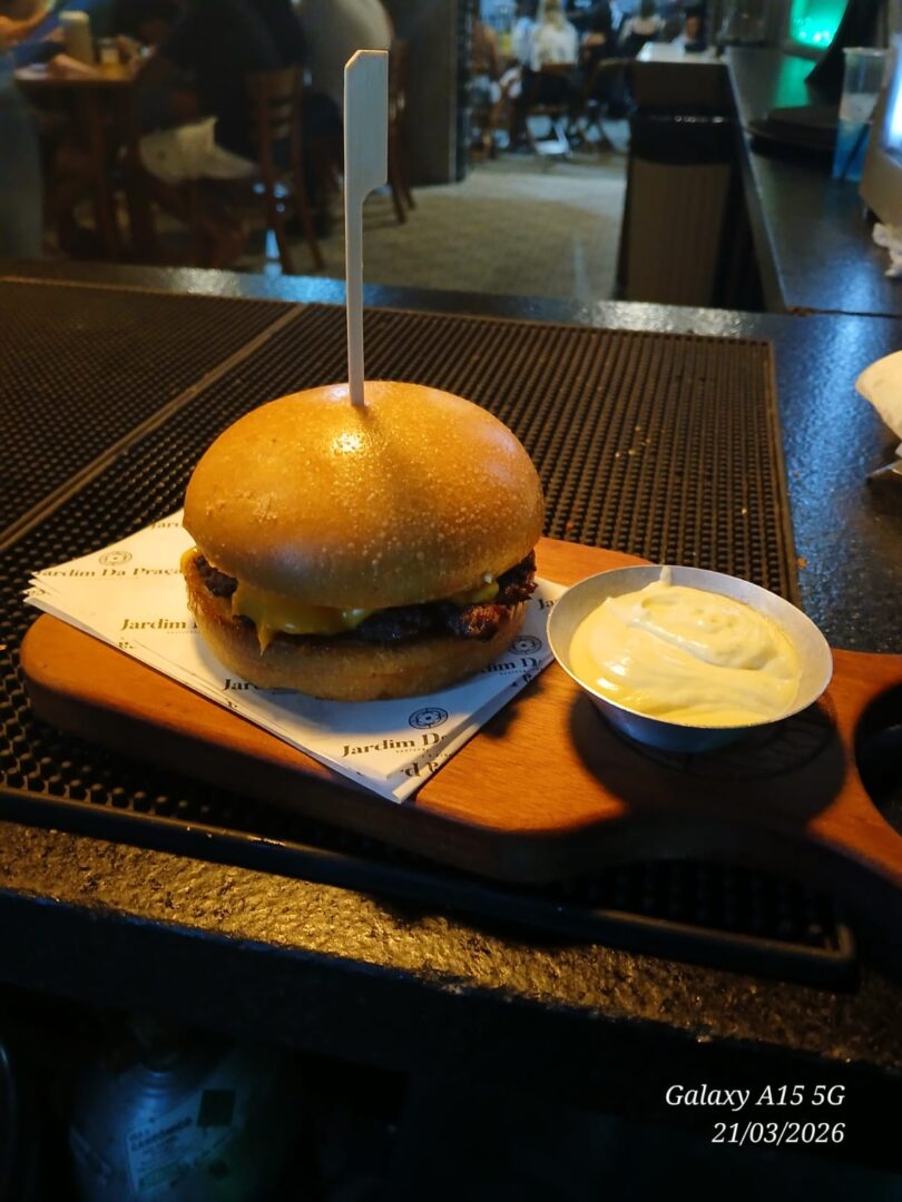 Pão roseta, hambúrguer, molho gorgonzola e cebola caramelizada