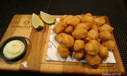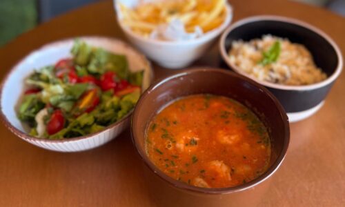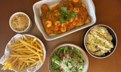 salmão grelhado 400gr, alcaparra, camarão à manteiga, champignon, arroz piamontese, farofa, salada e batata frita