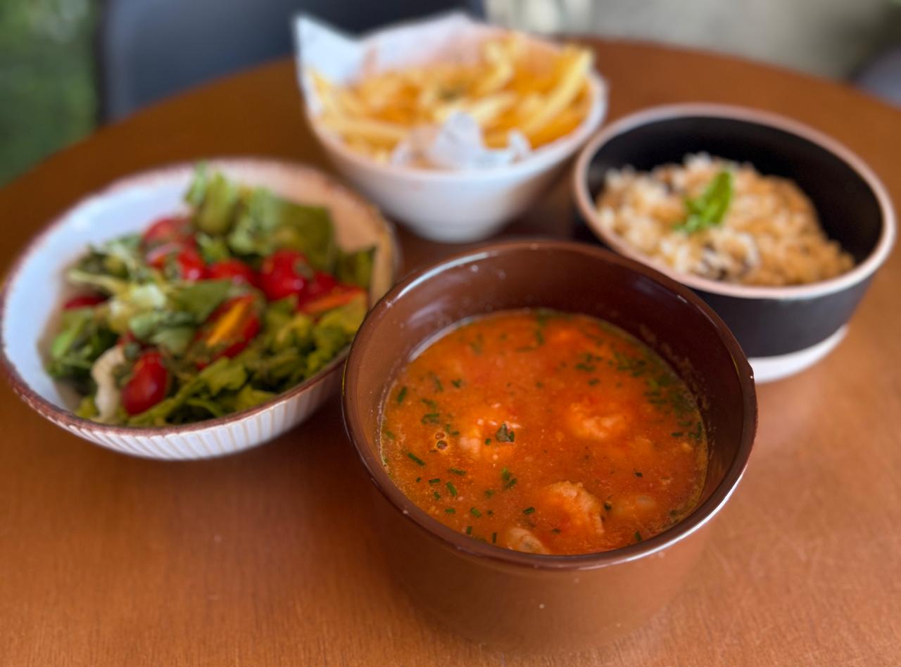 camarão ensopado, arroz piamontese, farofa, salada e batata frita