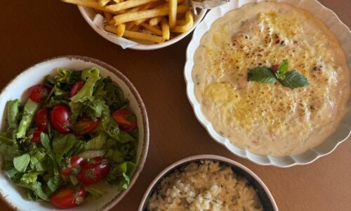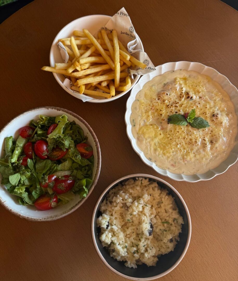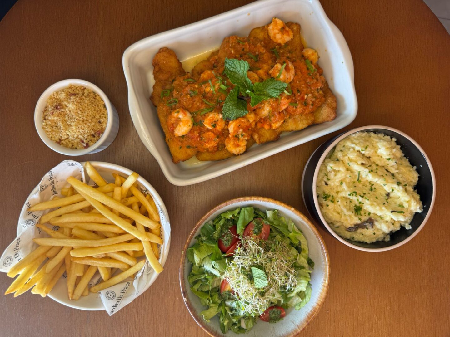 camarão 4 queijos, arroz piamontese, farofa, salada e batata frita