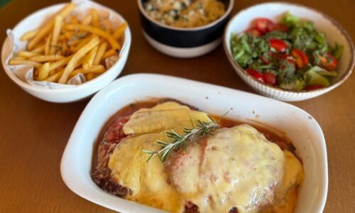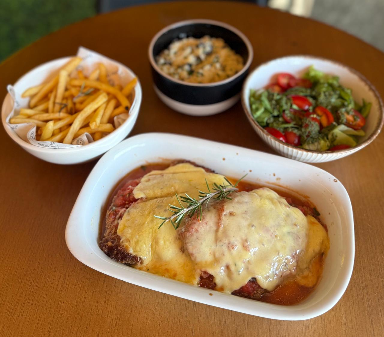 file mignon a parmegiana, arroz piamontese, farofa, salada e batata frita