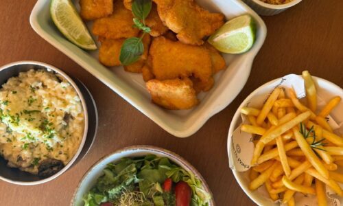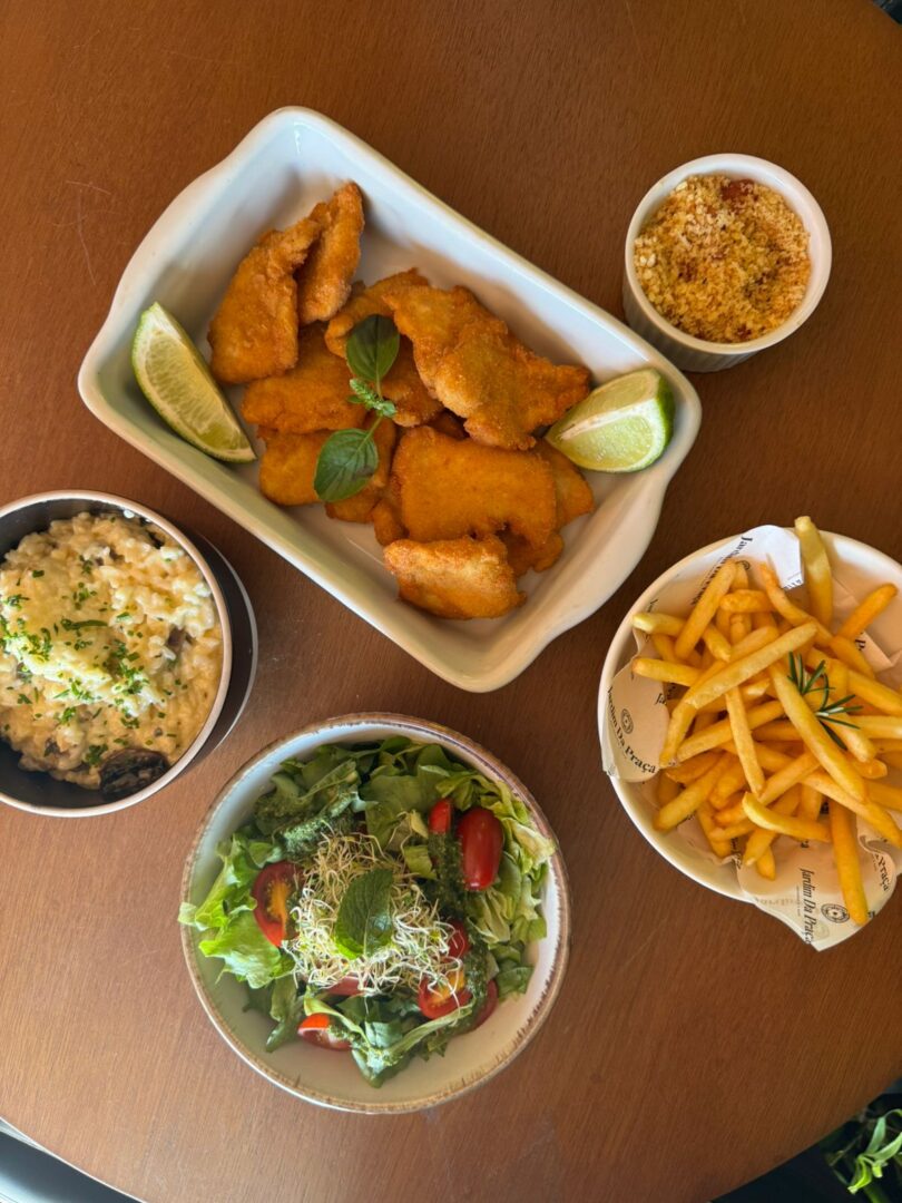 file de peixe empanado 400gr, arroz piamontese, farofa, salada e batata frita