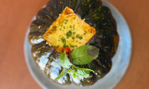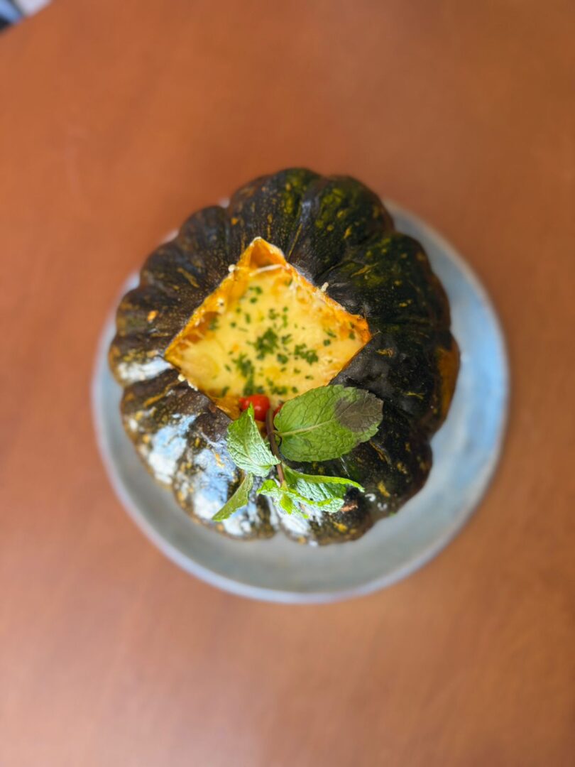 camarão cremoso servido na moranga, receita especial da casa, arroz piamontese, farofa, salada e batata frita